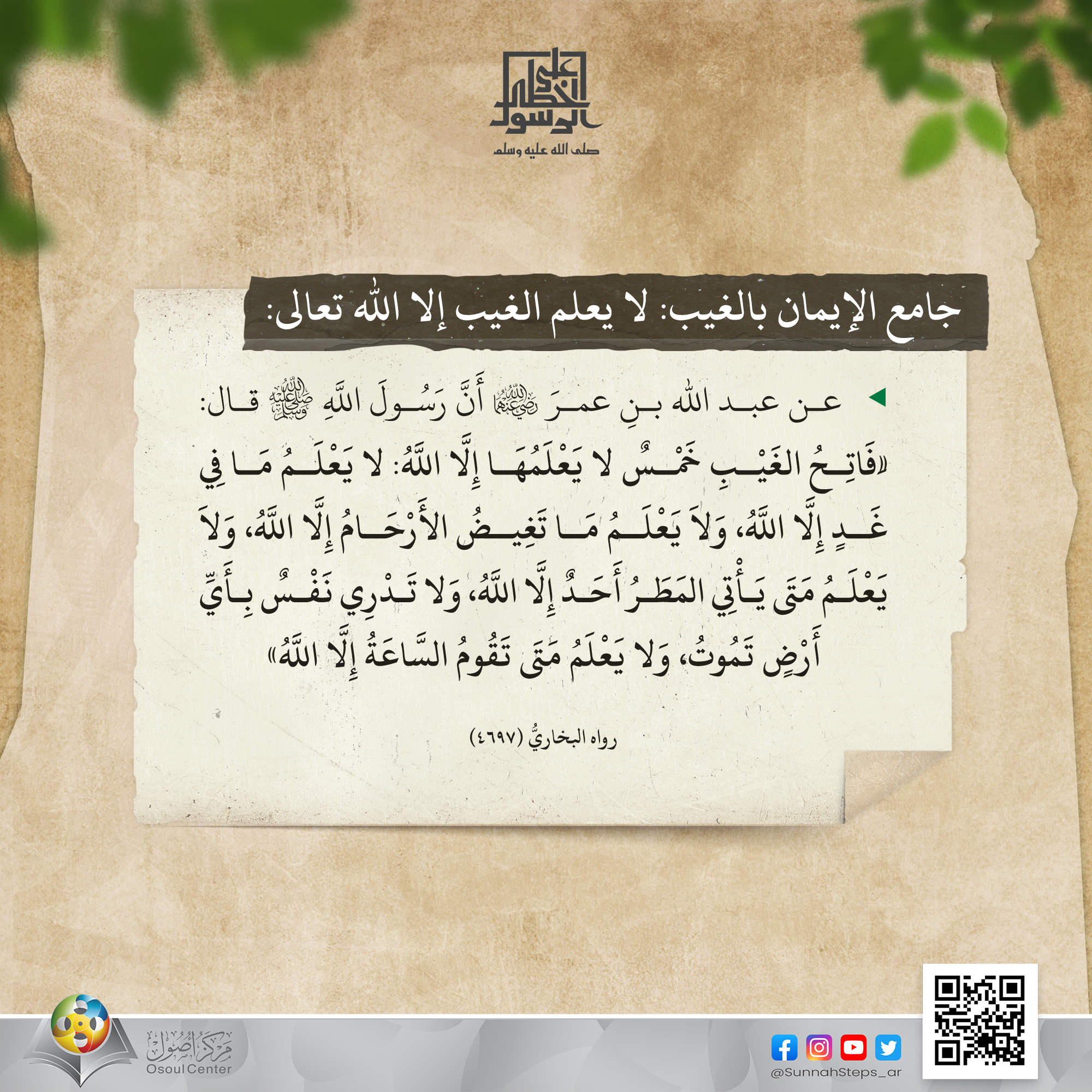 عن عبد الله بنِ عمرَ رضي الله عنهما أَنَّ رَسُولَ اللَّهِ ﷺ قَالَ:«مَفَاتِحُ الغَيْبِ خَمْسٌ لا يَعْلَمُهَا إِلَّا اللَّهُ:لا يَعْلَمُ مَا فِي غَدٍ إِلَّا اللَّهُ،وَلاَ يَعْلَمُ مَا تَغِيضُ الأَرْحَامُ إِلَّا اللَّهُ،وَلاَ يَعْلَمُ مَتَى يَأْتِي المَطَرُ أَحَدٌ إِلَّا اللَّهُ،وَلا تَدْرِي نَفْسٌ بِأَيِّ أَرْضٍ تَمُوتُ،وَلا يَعْلَمُ مَتَى تَقُومُ السَّاعَةُ إِلَّا اللَّهُ»