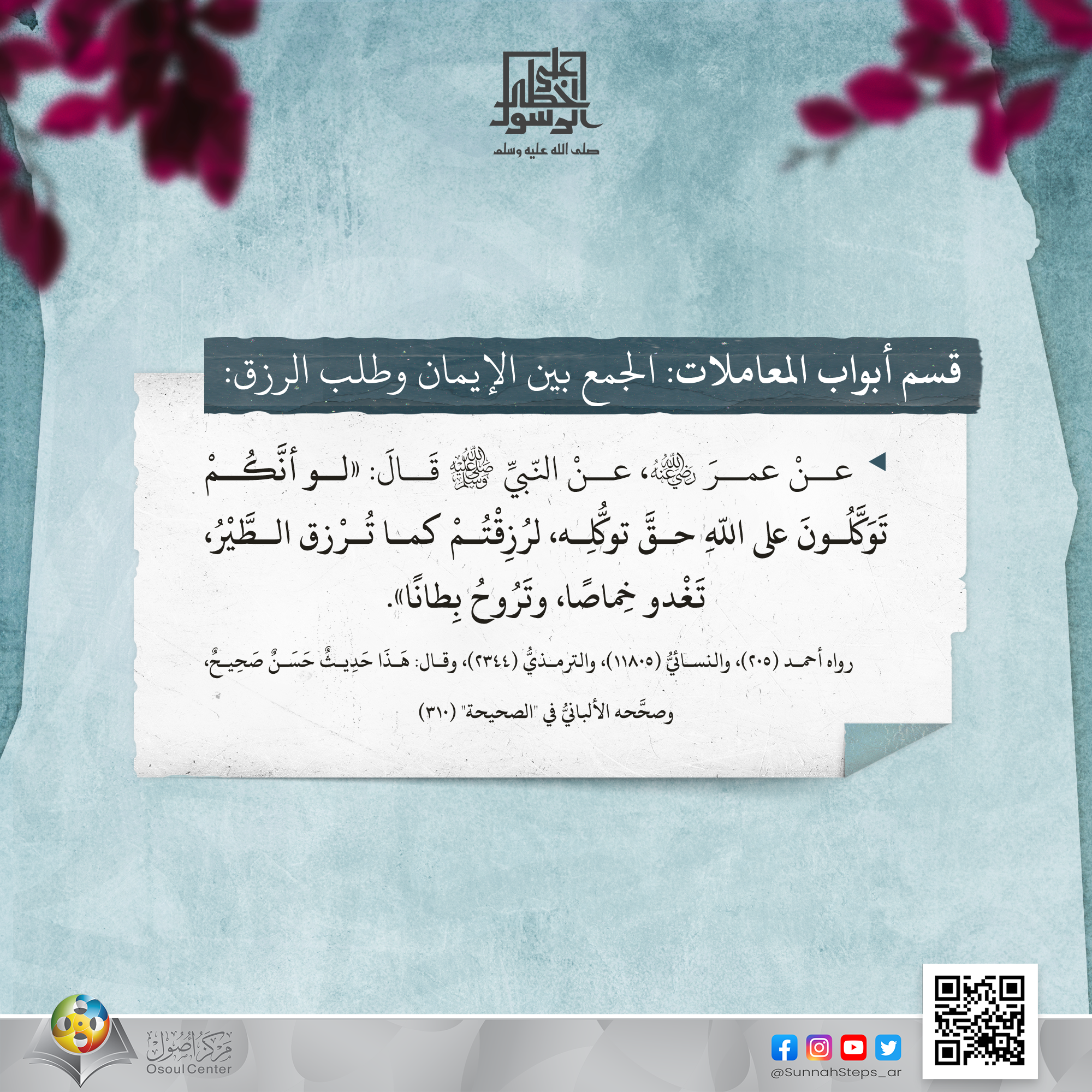 عنْ عمرَ رضي الله عنه، عنْ النّبيِّ ﷺ قال: «لو أنَّكُمْ تَوَكَّلُونَ على اللهِ حقَّ توكُّلِه، لرُزِقْتُمْ كما تُرْزَقُ الطَّيْرُ، تَغْدو خِماصًا، وتَرُوحُ بِطانًا»