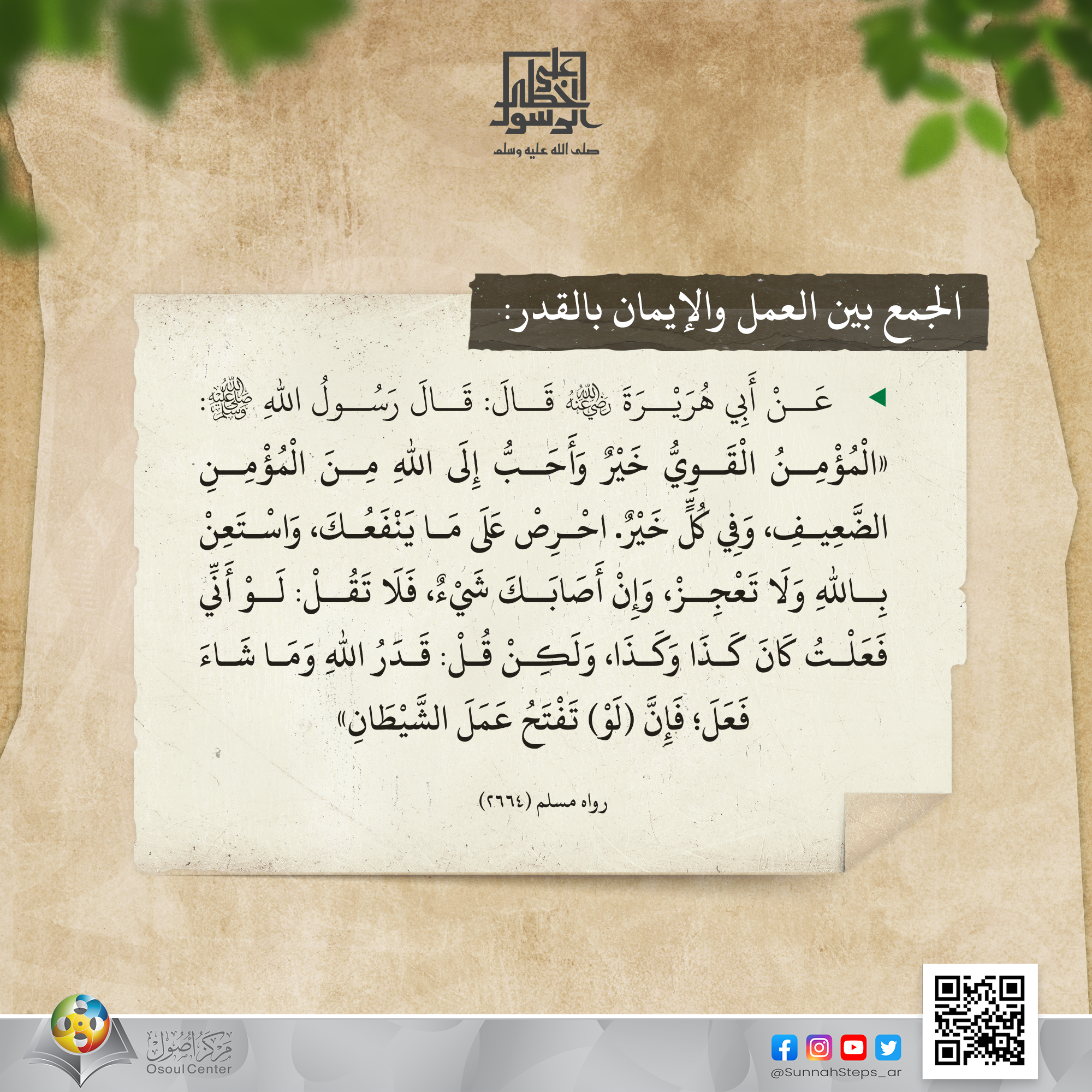 عَنْ أَبِي هُرَيْرَةَ رضي الله عنه، قَالَ: قَالَ رَسُولُ اللهِ ﷺ: «الْمُؤْمِنُ الْقَوِيُّ خَيْرٌ وَأَحَبُّ إِلَى اللهِ مِنَ الْمُؤْمِنِ الضَّعِيفِ، وَفِي كُلٍّ خَيْرٌ. احْرِصْ عَلَى مَا يَنْفَعُكَ، وَاسْتَعِنْ بِاللهِ وَلَا تَعْجِزْ، وَإِنْ أَصَابَكَ شَيْءٌ، فَلَا تَقُلْ: لَوْ أَنِّي فَعَلْتُ كَانَ كَذَا وَكَذَا، وَلَكِنْ قُلْ: قَدَرُ اللهِ وَمَا شَاءَ فَعَلَ؛ فَإِنَّ (لَوْ) تَفْتَحُ عَمَلَ الشَّيْطَانِ» رواه مسلم