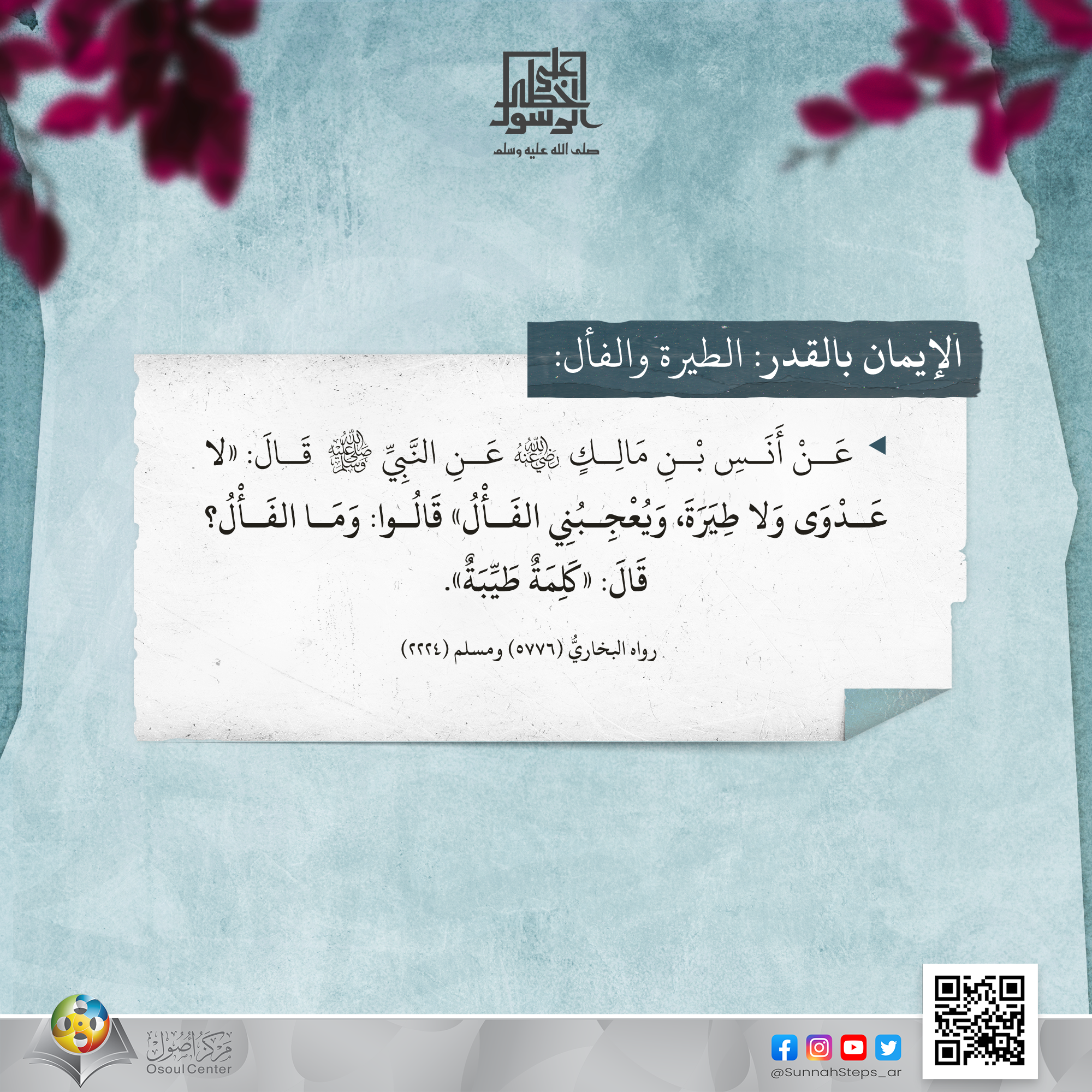 عَنْ أَنَسِ بْنِ مَالِكٍ - رَضِيَ اللَّهُ عَنْهُ - عَنِ النَّبِيِّ ﷺ قَالَ: «لا عَدْوَى وَلا طِيَرَةَ، وَيُعْجِبُنِي الفَأْلُ» قَالُوا: وَمَا الفَأْلُ؟ قَالَ: «كَلِمَةٌ طَيِّبَةٌ» متفق عليه
