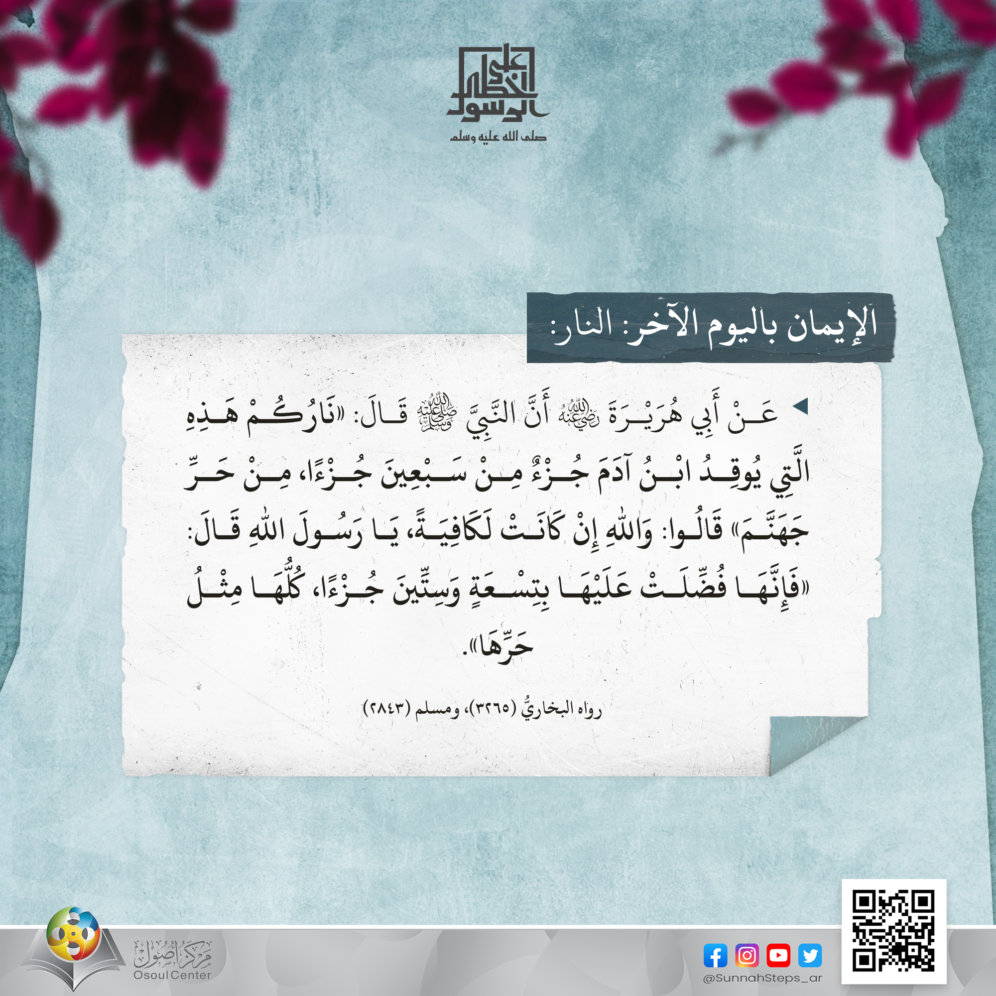 عَنْ أَبِي هُرَيْرَةَ رضى الله عنه، أَنَّ النَّبِيَّ ، قَالَ: «نَارُكُمْ هَذِهِ الَّتِي يُوقِدُ ابْنُ آدَمَ جُزْءٌ مِنْ سَبْعِينَ جُزْءًا مِنْ حَرِّ جَهَنَّمَ» قَالُوا: وَاللهِ إِنْ كَانَتْ لَكَافِيَةً يَا رَسُولَ اللهِ! قَالَ: «فَإِنَّهَا فُضِّلَتْ عَلَيْهَا بِتِسْعَةٍ وَسِتِّينَ جُزْءًا، كُلُّهَا مِثْلُ حَرِّهَا».