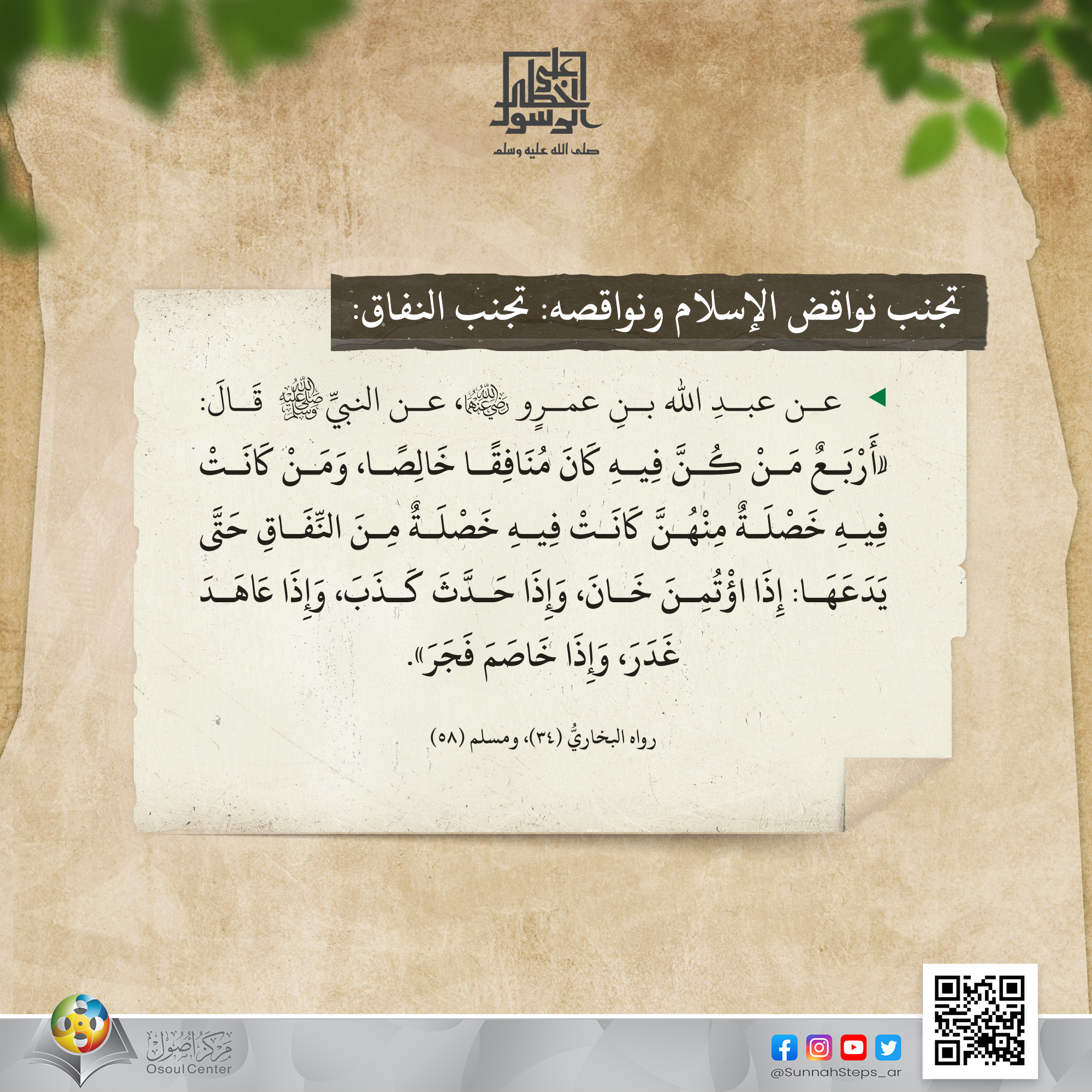 عن عبدِ الله بنِ عمرٍورضي الله عنه عن النبيِّ ، قال:«أَرْبَعٌ مَنْ كُنَّ فِيهِ كَانَ مُنَافِقًا خَالِصًا، وَمَنْ كَانَتْ فِيهِ خَصْلَةٌ مِنْهُنَّ كَانَتْ فِيهِ خَصْلَةٌ مِنَ النِّفَاقِ حَتَّى يَدَعَهَا:إِذَا اؤْتُمِنَ خَانَ،وَإِذَا حَدَّثَ كَذَبَ، وَإِذَا عَاهَدَ غَدَرَ،وَإِذَا خَاصَمَ فَجَرَ» متفق عليه