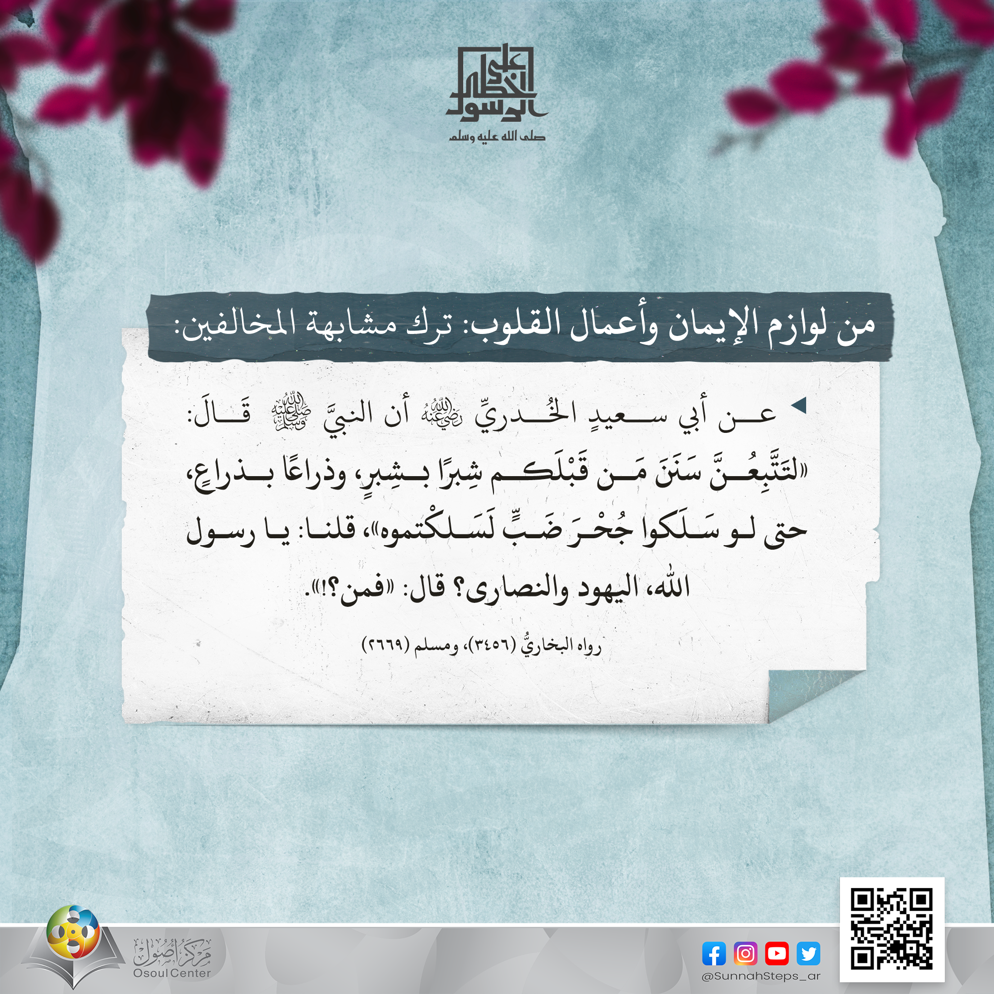 عن أبي سعيدٍ الخُدريِّ رضي الله عنه، أن النبيَّ ﷺ قال:«لتَتَّبِعُنَّ سَنَنَ مَن قَبْلَكم، شِبرًا بشِبرٍ، وذراعًا بذراعٍ، حتى لو سَلَكوا جُحْرَ ضَبٍّ لَسَلكْتموه»، قلنا: يا رسول الله، اليهود والنصارى؟ قال: «فمَن؟!»