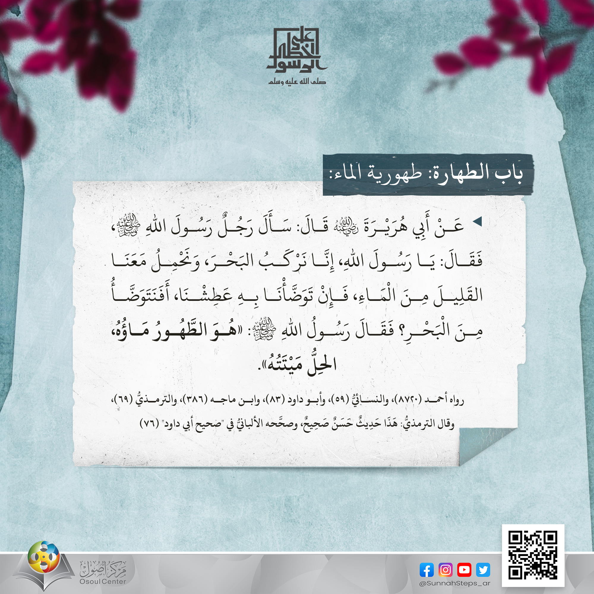 عن أبي هُرَيْرَةَ رضي الله عنه، قال:سَأَلَ رَجُلٌ رَسُولَ اللهِ ، فَقَالَ: يَا رَسُولَ اللهِ، إِنَّا نَرْكَبُ البَحْرَ، وَنَحْمِلُ مَعَنَا القَلِيلَ مِنَ الْمَاءِ، فَإِنْ تَوَضَّأْنَا بِهِ عَطِشْنَا، أَفَنَتَوَضَّأُ مِنَ الْبَحْرِ؟ فَقَالَ رَسُولُ اللهِ : «هُوَ الطَّهُورُ مَاؤُهُ، الحِلُّ مَيْتَتُهُ»