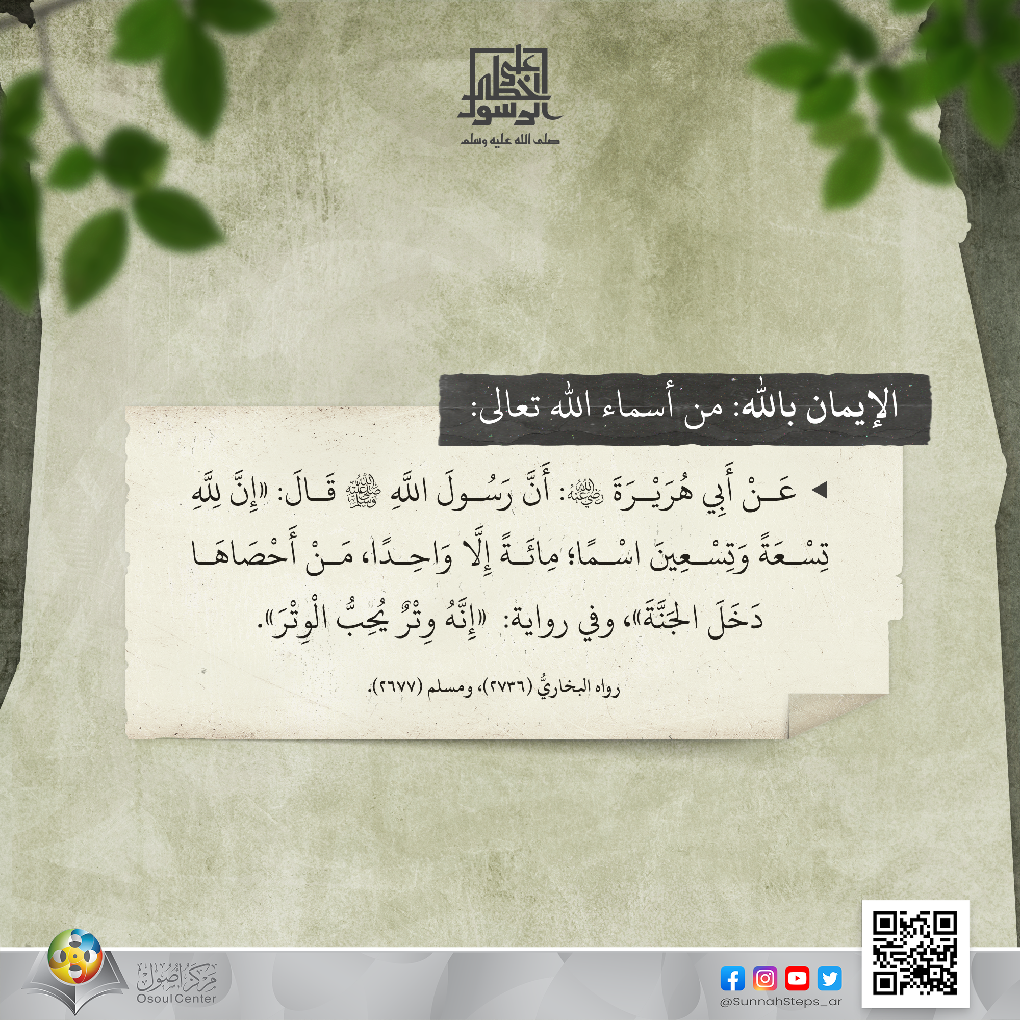 عَنْ أَبِي هُرَيْرَةَ رضى الله عنه : أَنَّ رَسُولَ اللَّهِ ﷺ قَالَ: «إِنَّ لِلَّهِ تِسْعَةً وَتِسْعِينَ اسْمًا؛ مِائَةً إِلَّا وَاحِدًا، مَنْ أَحْصَاهَا دَخَلَ الجَنَّةَ»، زَادَ في رواية: «إِنَّهُ وِتْرٌ يُحِبُّ الْوِتْرَ». متفق عليه